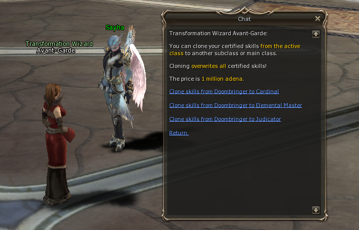 Cloning allow you to use certified skills also on subclasses. The new feature is available from Avant-Garde in the Ivory Tower. The cost of cloning is 1 million adena.