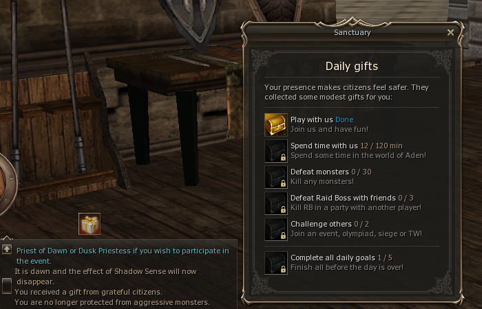 Daily Gift D-Grade | Daily gift from grateful citizens. Cannot be exchanged, dropped, or destroyed. Inside you can find one of: Nevit's Voice, Rune of Exp. Points 30%, Vitality Maintaining Potion, Adena, Ancient Adena, Festival Coin, Silver Coin, Gold Coin, Soul Ore, Spirit Ore, Knight's Epaulette, Gemstone D, Blessed Scroll: Enchant Weapon (D-Grade), Blessed Scroll: Enchant Armor (D-Grade), Scroll: Enchant Weapon (D-Grade), Scroll: Enchant Armor (D-Grade) |